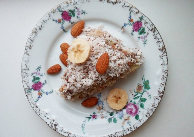 Перемолите орехи в блендере или в мясорубке. Измельчите в блендере бананы до состояния кашицы, добавьте ваниль и корицу. Промойте и порубите сухофрукты. В большое глубокое блюдо выложите слой орехов, полейте его банановым пюре и посыпьте сухофруктами. Сверху выложите еще один корж и снова залейте его банановым пюре и посыпьте сухофруктами.Торт можно украсить кокосовой стружкой. Поставьте готовый торт на 30 минут в морозилку или на 2-3 часа в холодильник для застывания.
